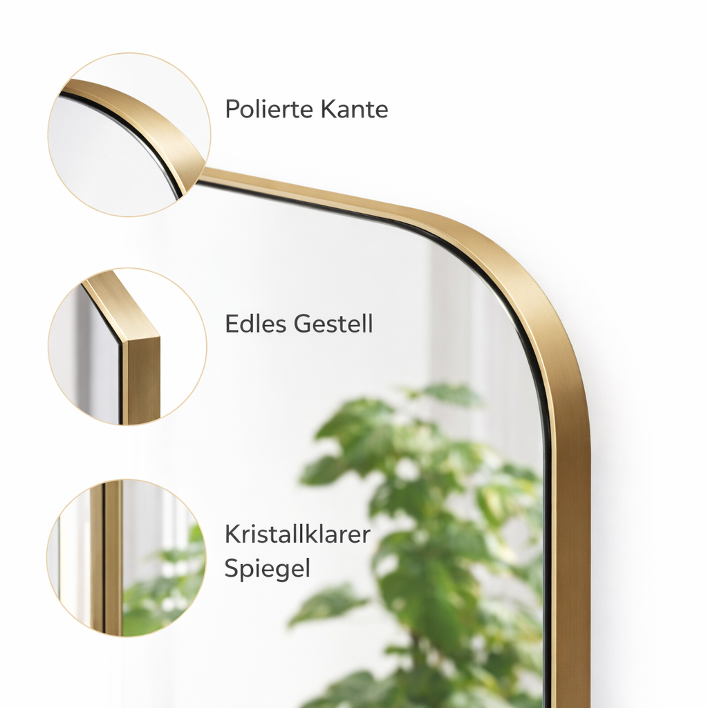 Jag köpte den till sovrummet och är supernöjd! Den guldfärgade ramen är elegant, spegeln står stadigt och glansen är perfekt. Leveransen var mycket snabb.